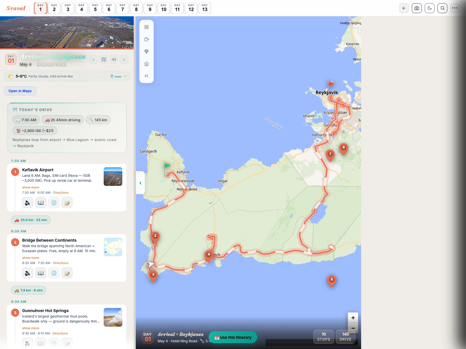 Every public trip on Sravel is fork-able. Tap “use this itinerary,” set your dates, and the AI adapts the whole thing — restaurants, weather, drive times — to your trip.